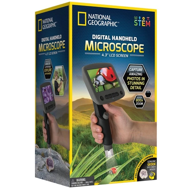 National Geographic’s Digital Handheld Microscope is a fantastic way to explore the microscopic world and share your findings with friends, family, and classmates! The wireless, portable microscope includes a built-in camera that can capture HD photos and video, plus it contains 10 professionally prepared biological slide samples, and 10 blank slides.