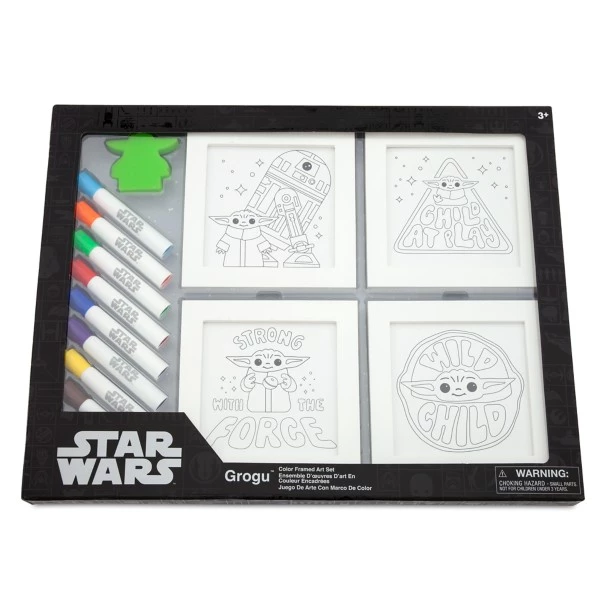- Set includes four framed sketches on canvas, eight colored markers, and Grogu-shaped eraser