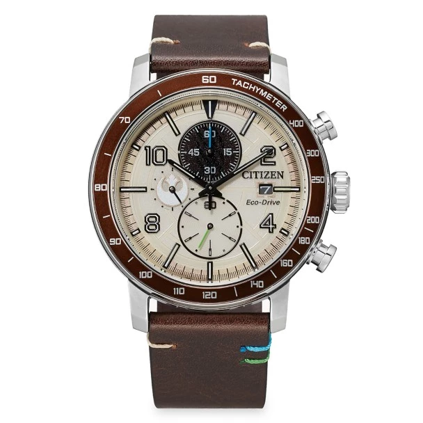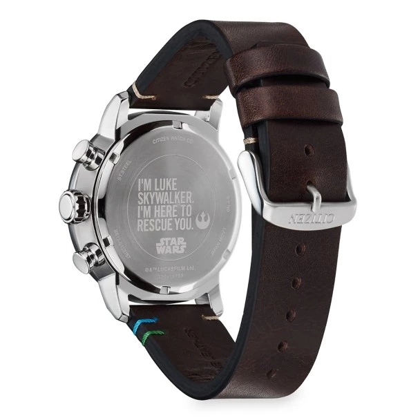Become a Jedi master with the Star Wars Luke Skywalker timepiece from CITIZEN. Inspired by the humble farm boy from Tatooine, a stainless steel case with a brown aluminum bezel is complemented by a brown leather strap with blue and green safety stitches representing the colors of Skywalker’s light saber. Powered by Eco-Drive technology, this Star Wars watch never needs a battery.