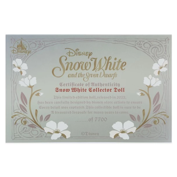 ”Magic mirror on the wall, who is the fairest one of all?” In honor of the 85th Anniversary of Snow White and the Seven Dwarfs, this collectible doll imagines the enchanting bride as her happily-ever-after dreams come true. A classic beauty with ”lips red as the rose, hair black as ebony, skin white as snow,” celebrate Walt Disney’s original Princess with this storybook wedding keepsake.
