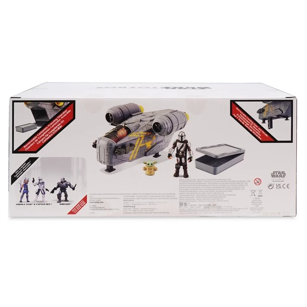 Our Star Wars Toybox Set includes the two central characters from the Disney+ series Star Wars: The Mandalorian. Action figures of The Mandalorian and the Child called Grogu fit perfectly in the cockpit of the Razor Crest, which features light and sound effects, retractable landing gear, projectile missiles and more!